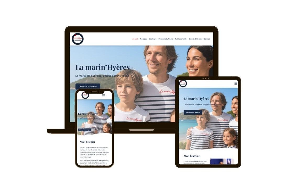 La marin’Hyères est une marque textile locale qui revisite l’emblématique marinière à travers une identité forte, ancrée dans la ville de Hyères. L’objectif du projet était de créer un site vitrine immersif, capable de raconter l’histoire de la marque, valoriser ses créations et structurer sa présence digitale.